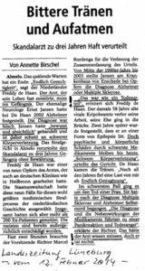 Freddy de Haan egyike volt az orvos 9 áldozatának, aki német klinikákon is, mint például a Heilbronni Klinikán is, dolgozott. Az államügyészség ezt a kilenc esetet választotta ki a holland történelem minden bizonnyal a legnagyobb orvostudományi büntetőperéhez. Összesen azonban az orvos több mint 200 volt betege jelentkezett, akiknek többségét a bírósági peren kívül már kártalanítottak.