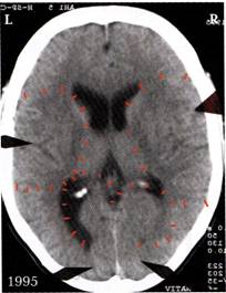 10 évesen egy szaltó ugrása közben az uszodában, amikor fejét hátul beütötte az ugródeszkába, elszenvedett egy „birtokboszankodás-konfliktus”-t és egy „esés-konfliktus”-t. Egyébként lehet látni mindkét kamra hátsó szarvában a Hameri gócot, a jobb agyféltekén a bal (partnert érintő) petefészket a megoldási fázisban petefészekcisztával, a bal agyféltekén a gyermekre vonatkozó, még aktív Hameri gócot. A két alsó nyíl a „nyakba szakadó konfliktus” reléjére mutat. A Hameri gócok félig aktív, félig megoldási fázisban vannak (= függőben lévő gyógyulás).