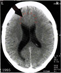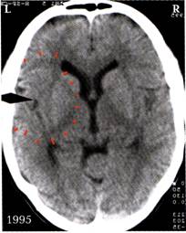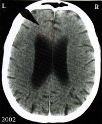2. ábra: A bal oldalon látható nyíl ugyanarra az exhibicionista által okozott „szexuális konfliktus”-ra utal. Látható a góc körüli a halvány ödémperem. Mivel a páciens a birtokbosszankodást / eséskonfliktust időközben már megoldotta, feloldhatóvá válhat végre a bal féltekei Hameri góc, mely ugye másodikként csapódott be. Úgy tűnik azonban, hogy ezen még nem tudta magát túltenni, mert jelenleg a nigériai barátjával nézeteltérései vannak, melyek ezen a sínen futnak. Így a „szexuális konfliktus”-a soha nem kerül igazán feloldásra.