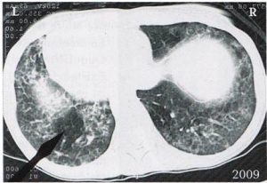 Tisztán látszik a (sötét) kaverna. A hozzá tartozó tumor 4 éven keresztül növekedett (1996-2000). Miután éjszakánként a páciens immáron 2 éve rendszeresen verejtékezik és köhög, felfedezték nála a tuberkulózist és kezelték. Itt látható bal oldalt annak maradványa.