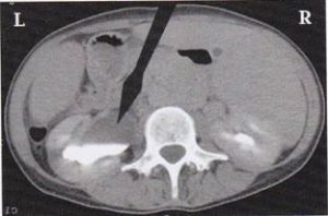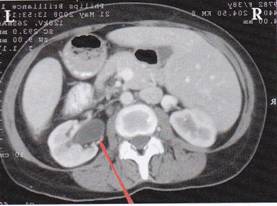 A bal vesének (l. nyíl) ún. tágult vesemedencéje van, ez a bizonyíték arra, hogy ott már lezajlott egy vesegyűjtőcsatorna-tuberkulózis folyamat.