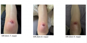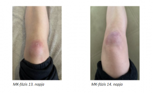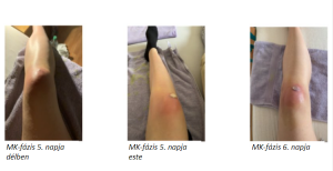 A terápia: kímélni, lábakat felpolcolni, kibírni. 5 nappal a megoldás után egy gennyhólyag alakult ki a térdkalács alján. Estére már akkora volt, mint egy lefelé fordított Toffifee. Éjjel fel is nyílt. Ez önmagában nem fájt. A gennynek egyáltalán nem volt semmilyen szaga. Körülbelül 5 napig nedvedzett és gennyesedett. Ezután végigkísérhettem, milyen szépen gyógyul a seb. Két és fél hét múlva a seb meggyógyult. (Lásd a képeket.)